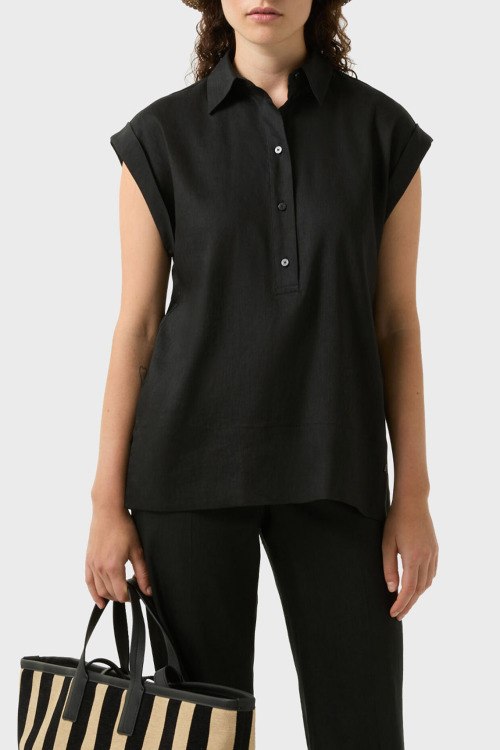 Детали: Женская черная блуза из льна и вискозы Rosalie от Bogner (Богнер). Отложной воротник, застежка на пуговицы, короткий рукав, свободный фасон, классическая длина