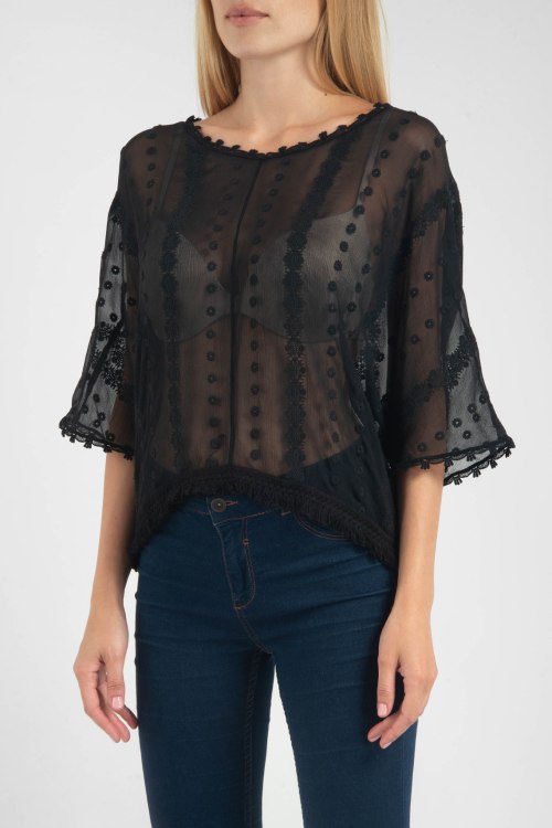 Оригинальная блуза свободного кроя с широкими рукавами 3/4, выполнена из полупрозрачного фактурного материала. Линия горловины - округлая, блуза декорирована перфорацией и вышивкой в тон изделия.