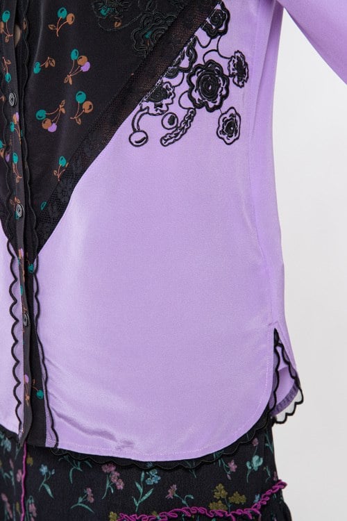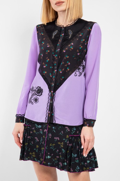 Женская сиреневая блуза из шелка от Coach (Коуч). Комбинированный дизайн, цветочный принт, круглый вырез горловины, застежка на пуговицы, длинные рукава, фигурный низ изделия, гипюровые вставки, вышивка.