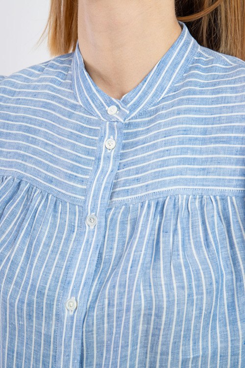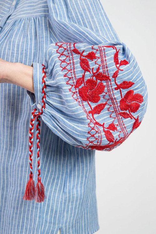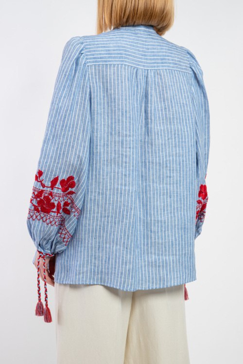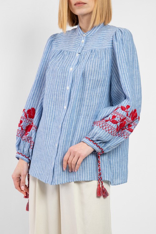 Женская голубая блуза из льна от Max Mara Weekend (Макс Мара Викенд). воротник-стойка, застежка на пуговицы, длинные объемные рукава, боковые разрезы, модель декорирована вышитым украинским орнаментом на манжетах, дизайн в вертикальную полоску по всей поверхности.
