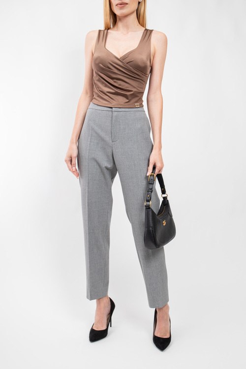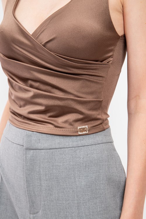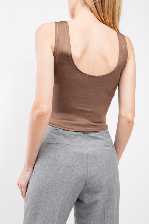 Женский коричневый эластичный топ от Roberta Biagi (Роберта Бьяджи). Модель без рукавов, глубокий вырез декольте, значок с логотипом, укороченная длина. Замеры для размера UNI: длина спереди: 41 см, ширина по груди: 35 см, ширина по талии: 31 см.