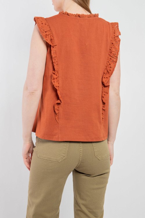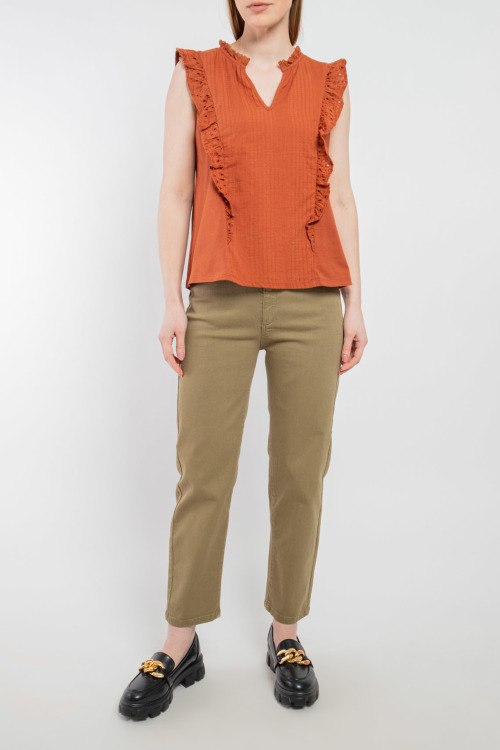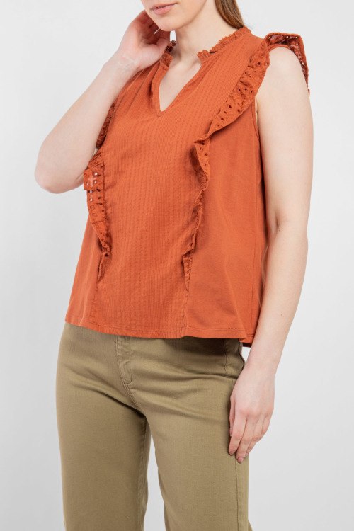 Женская терракотовая хлопковая блуза от Yerse (Йерс). Модель без рукавов, кружевной воротник-стойка, V-образный вырез, отделка рюшами, классическая длина.