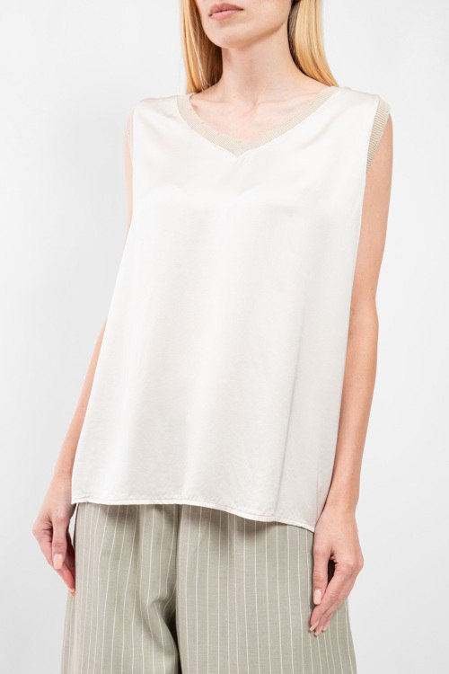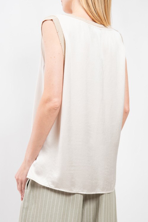 Женская кремовая блуза из вискозы от Atelier Emi (Ателье Эми). Модель без рукавов, V-образный вырез, свободный фасон, удлиненная длина. Горловина и манжеты с декоративными потертостями. Замеры для размера L: длина спереди: 65 см, ширина по груди: 55 см, ширина по талии: 60 см, ширина по бёдрам 64.