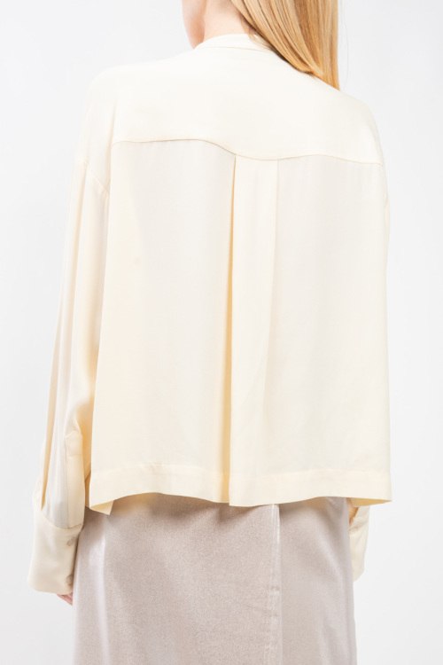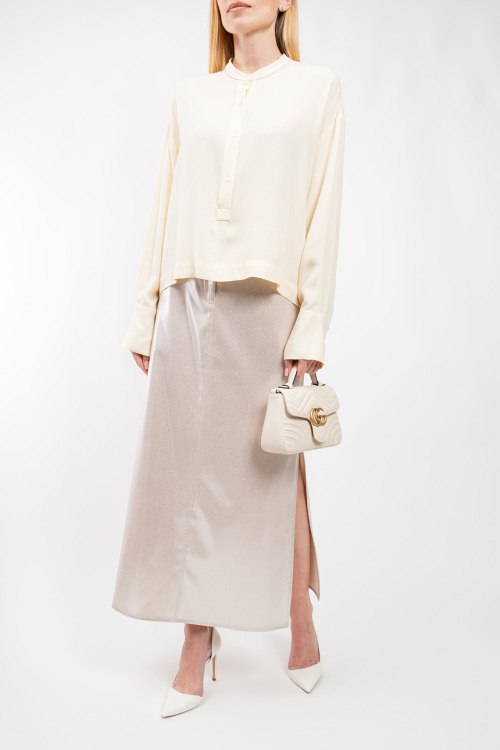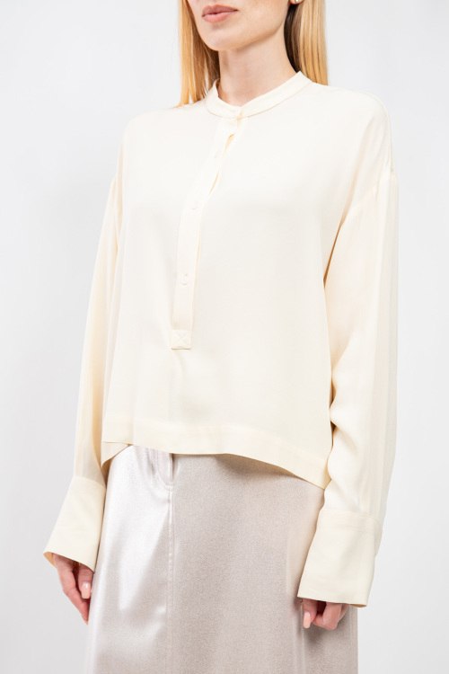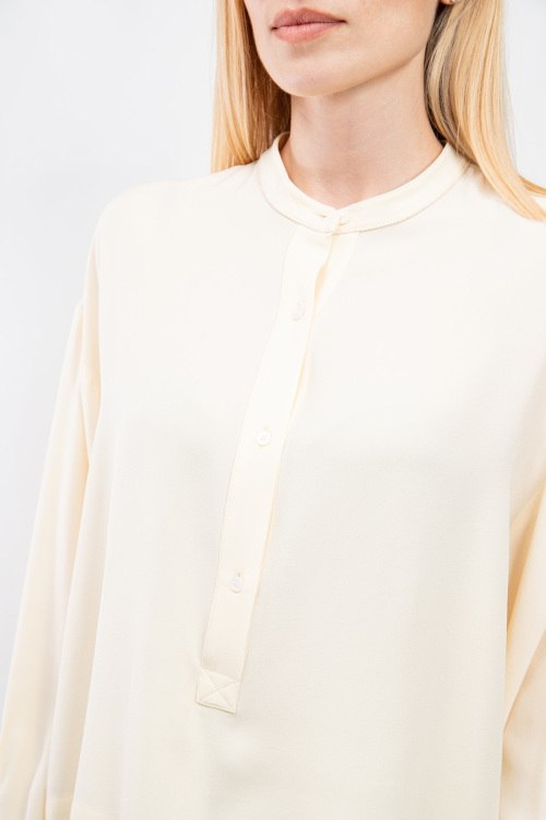 Женская кремовая блуза из вискозы и ацетатного волокна от Fabiana Filippi (Фабиана Филиппи). Круглый вырез горловины, застежка на пуговицы, манжеты на пуговицах, классическая длина. Замеры для размера 44: Длина спереди: 56 см, ширина по груди: 65 см, ширина по талии: 66 см, длина рукава: 47 см, ширина рукава: 24 см.