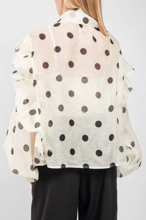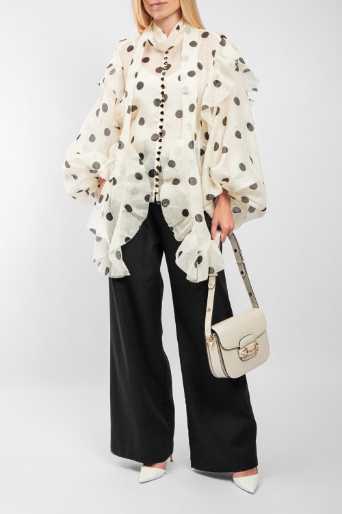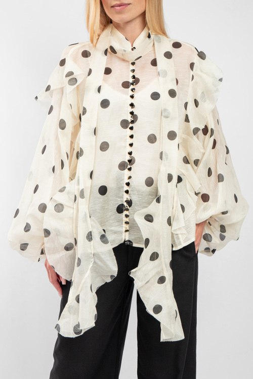Женская кремовая блуза из шелка и льна Crush от Zimmermann (Циммерманн). Принт в крупный горох, отделка рюшами, воротник-стойка с завязками, длинный широкий рукав, застежка на пуговицы в виде черных сердец, удлиненная длина.