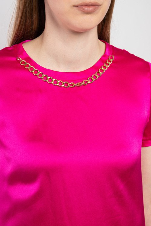 Женская шелковая блуза цвета фуксии от Pinko (Пинко). Декор золотистой цепью, круглый вырез горловины, короткий рукав, классическая длина