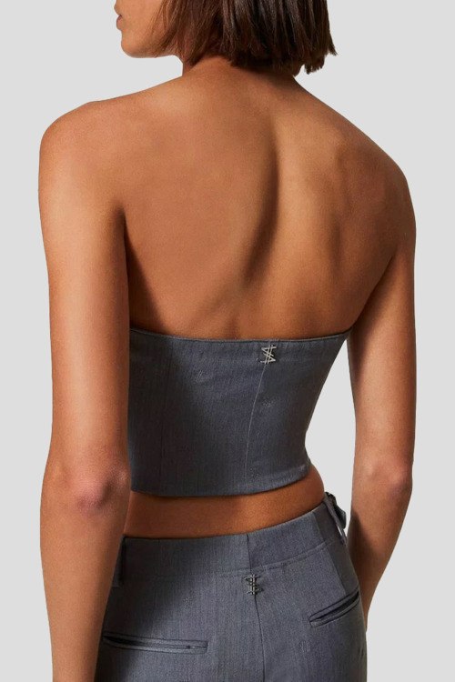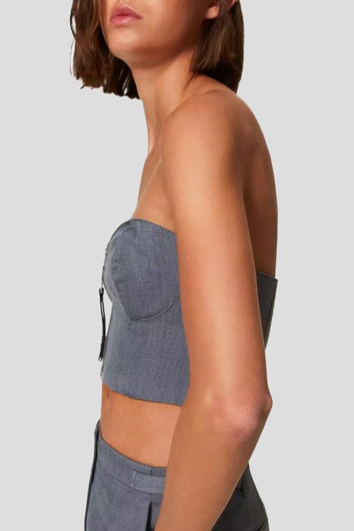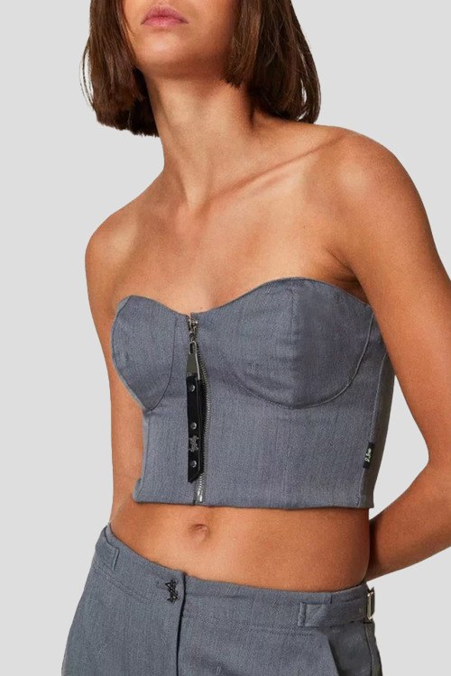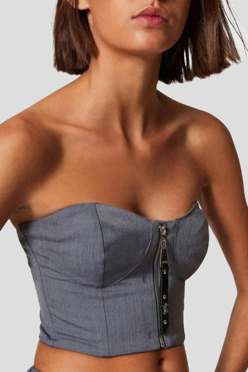 Женский серый топ-бьстюе из смесовой вискозы от TWINSET (Твинсет). Модель ограниченной серии за подписью художника Myfo для коллекции Actitude. Расшит символом доллара по всей поверхности, имеет облегающий силуэт, фигурные чашечки и застежку на металлическую молнию с пулером под кожу с логотипом в виде доллара, укороченная длина