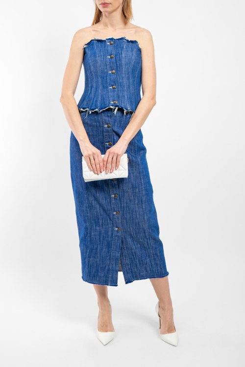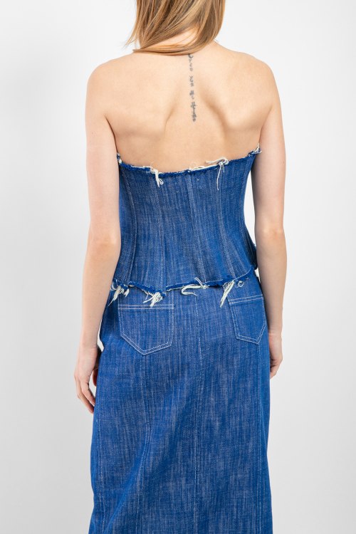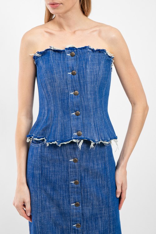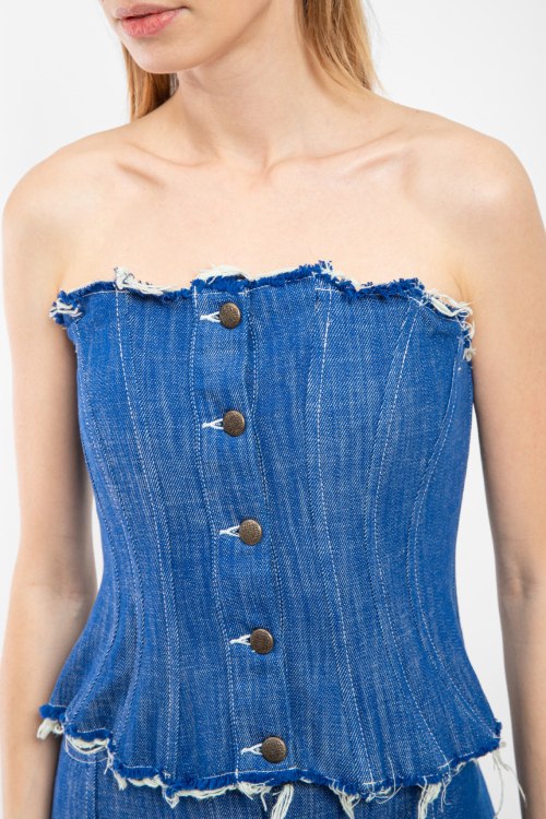 Женский синий джинсовый корсет Hisa от Balossa (Балосса). Модель с открытым верхом, застежка на пуговицы спереди, классическая длина, необрабаотанные края. Вы можете дополнить свой образ синей джинсовой юбкой.