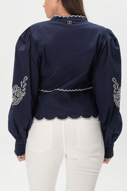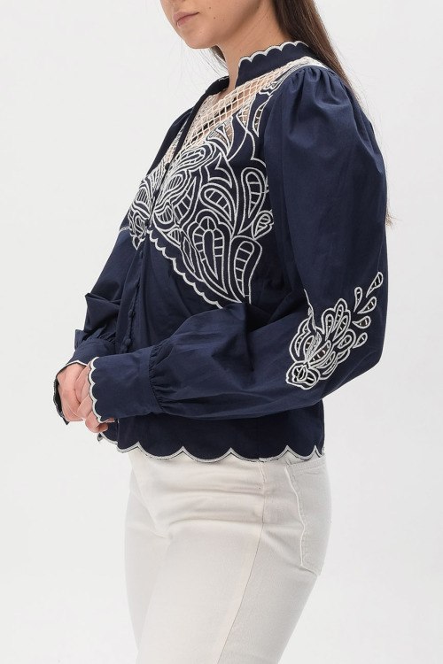 Детали: Женская темно-синяя хлопковая блуза от TWINSET (Твинсет). Дизайн с цветочной вышивкой, вставка из сетки на груди, воротник-стойка, застежка на пуговицы, длинный широкий рукав на манжетах, фигурный нижний край, классическая длина