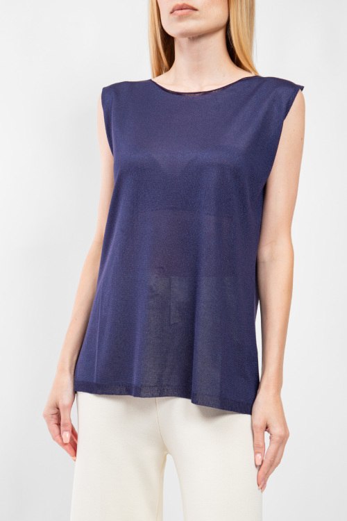 Женская темно-синяя блуза из вискозы от Panicale Cashmere (Паникале Кашемир). Модель без рукавов, круглый вырез горловины, классическая длина. Размер вещи на фото: 46, длина спереди: 67 см, ширина по груди: 51 см, ширина по талии: 51 см.