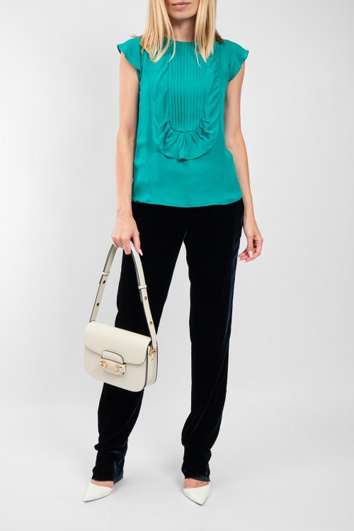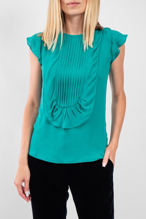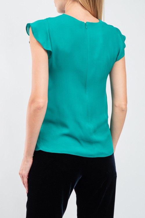 Женская зеленая шелковая блуза от Armani (Армани). Короткий расклешенный рукав, круглый вырез горловины, застежка-молния на спине, классическая длина.