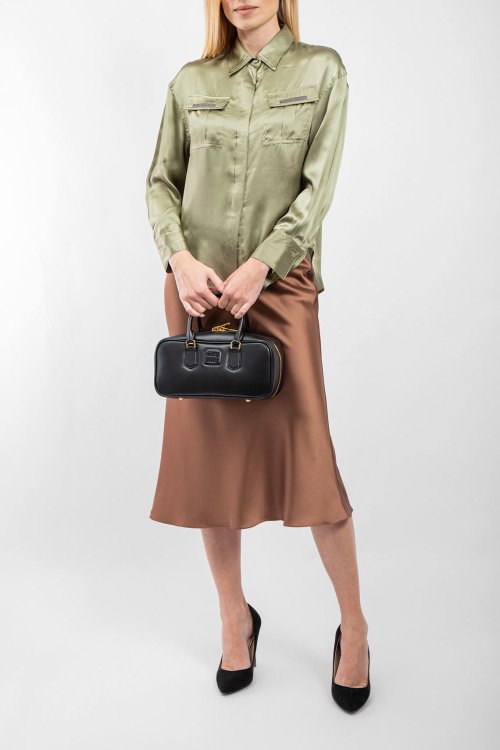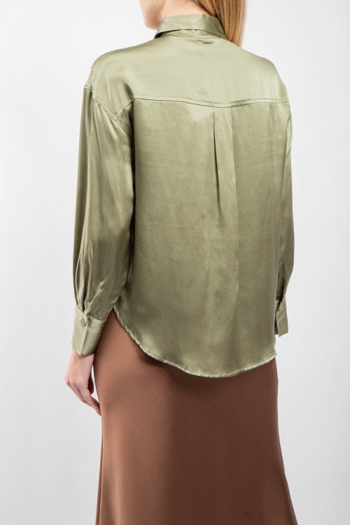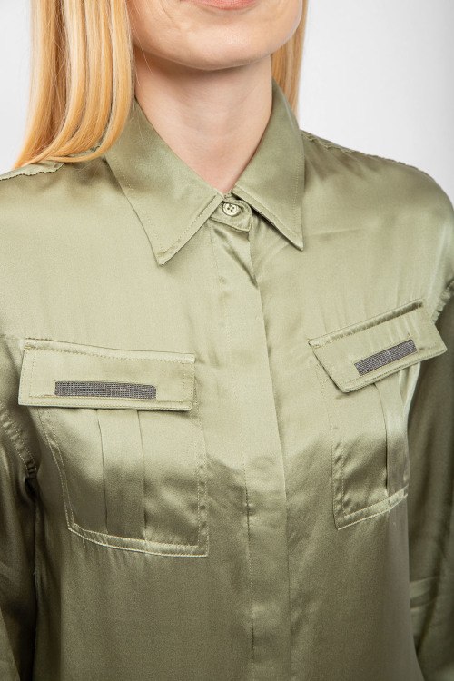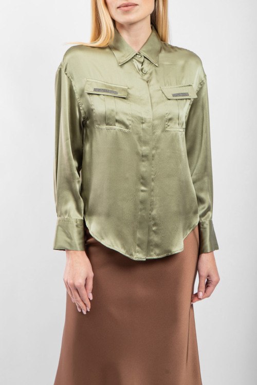 Детали: Женская оливковая шелковая блуза от Brunello Cucinelli (Брунелло Кучинелли). Два наклыдных кармана на груди, отложной воротник, скрытая застежка на пуговицы, манжеты на пуговицах, закругленный нижний край, классическая длина