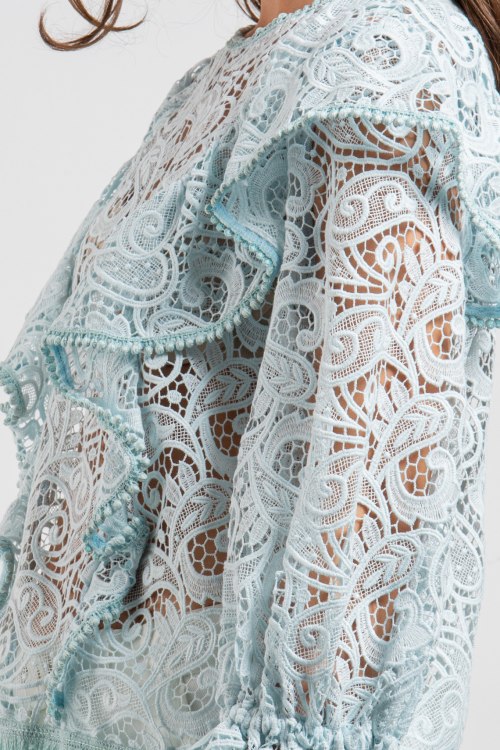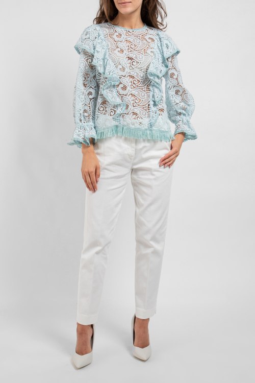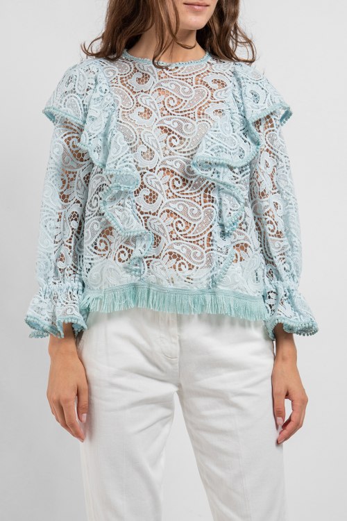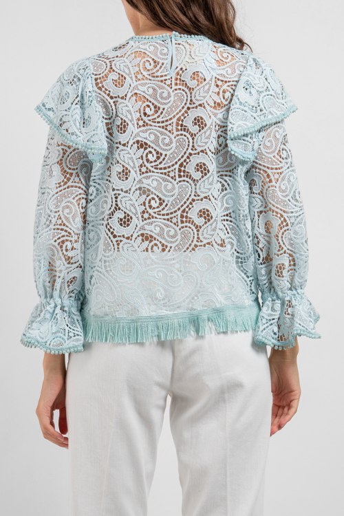 Женская бирюзовая гипюровая блуза от Pinko (Пинко). Классическая длина, круглый вырез горловины, полупрозрачная модель, длинные рукава, объемные воланы.