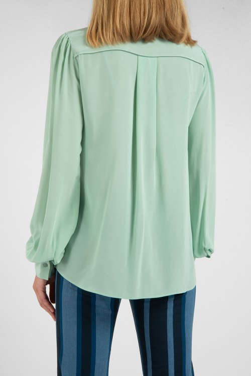 Шелковая блуза мятного цвета. Модель свободного силуэта, застегивается на пуговицы, классический воротник, длинные рукава с манжетами.