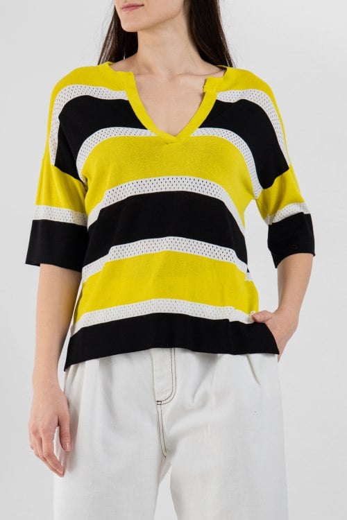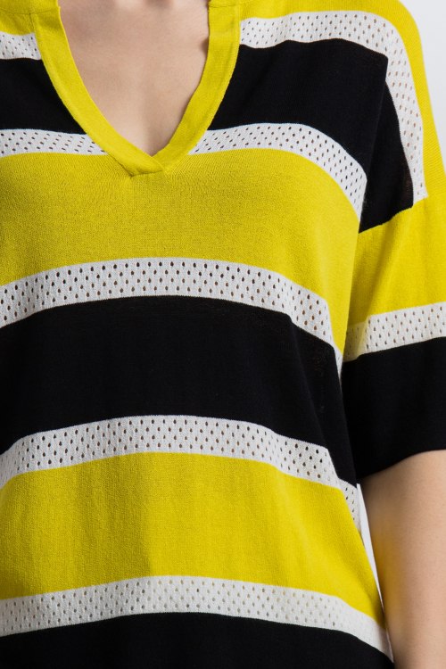Женская желто-черная блуза из вискозного микса от Beatrice (Беатрис). Классическая длина, свободный силуэт, V-образный вырез горловины, укороченные рукава, спущенная линия плеча, декор из перфорации, узор в полоску.