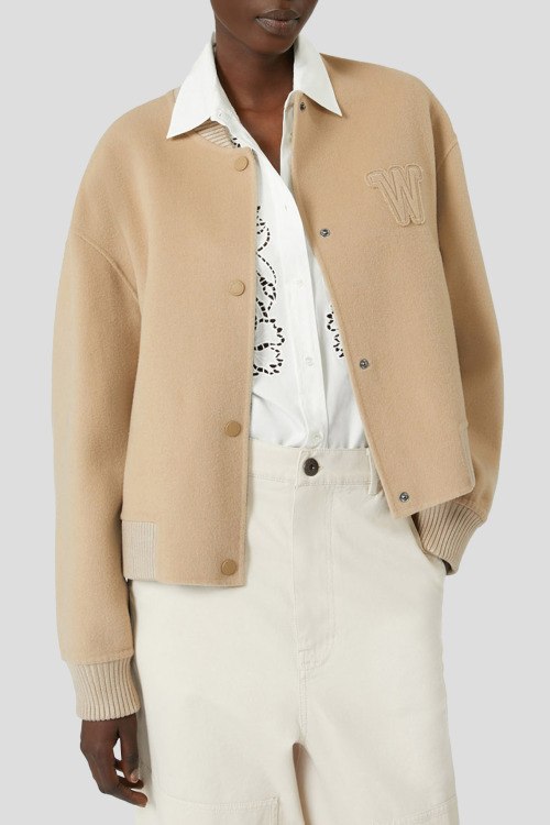 Детали: Женский бежевый шерстяной бомбер Zelante от Max Mara Weekend (Макс Мара Викенд). Нашивка с логотипом на груди, воротник-стойка, боковые карманы, застежка на кнопки, классическая длина, трикотажные манжеты и нижний край