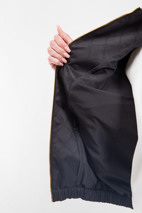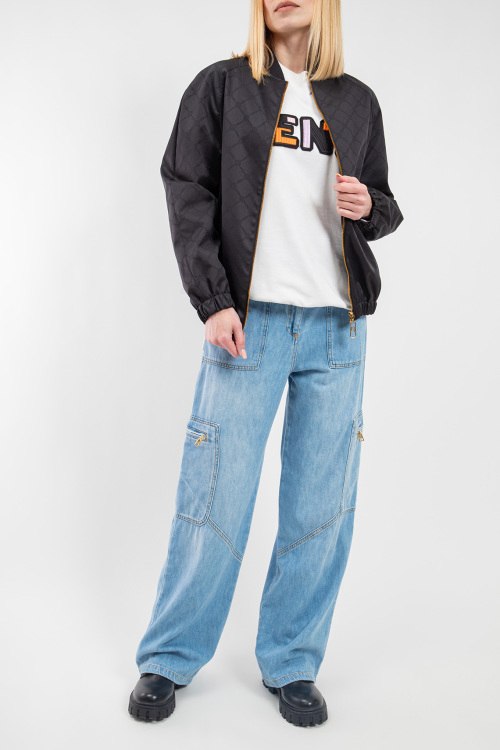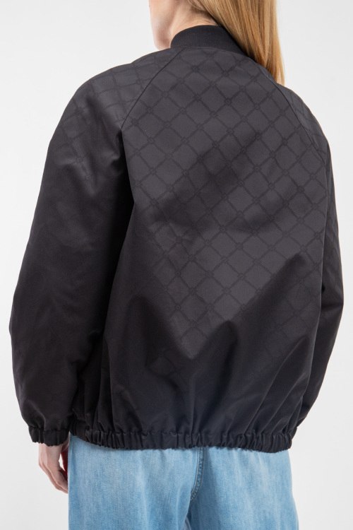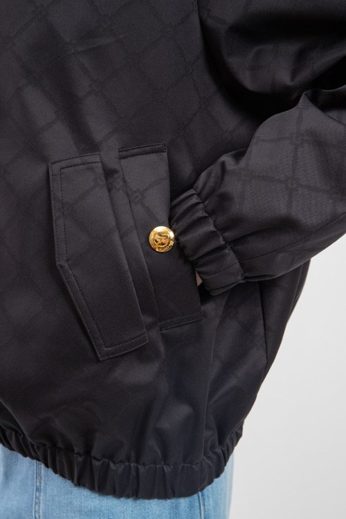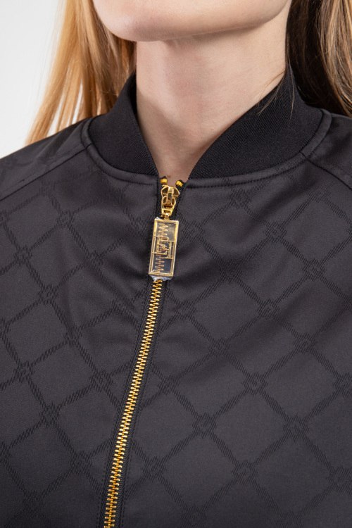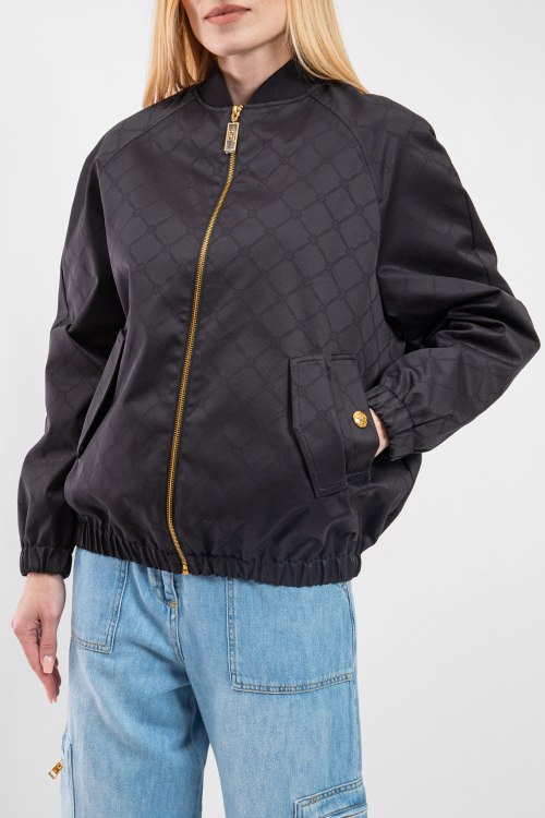 Детали: Женский черный бомбер от Elisabetta Franchi (Елизабетта Франчи). Узор с монограммой по всей поверхности, трикотажный воротник-стойка, боковые карманы с клапаном, застежка-молния с брендированным пулером, классическая длина, манжеты и нижний край на резинке