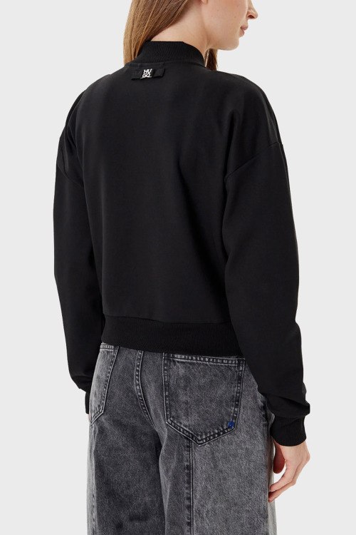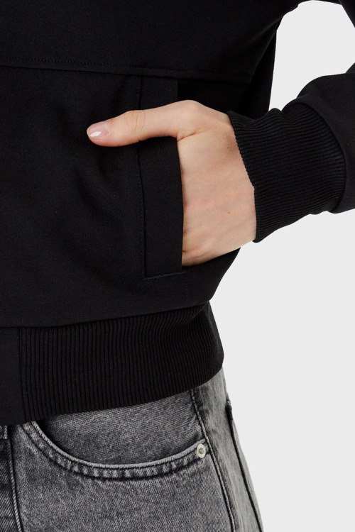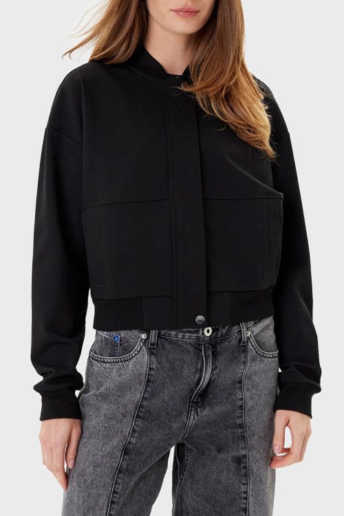 Детали: Женский черный трикотажный бомбер Dakure от Hugo by Hugo Boss (Хуго бай Хуго Босс). Воротник-стойка, нашивка с логотипом на спине, боковые карманы/, застежка на молнию и кнопки, классическая длина, трикотажные манжеты и нижний край