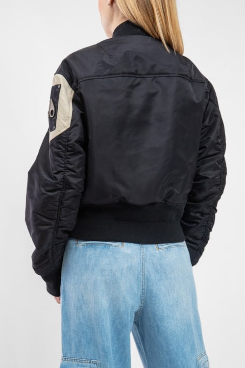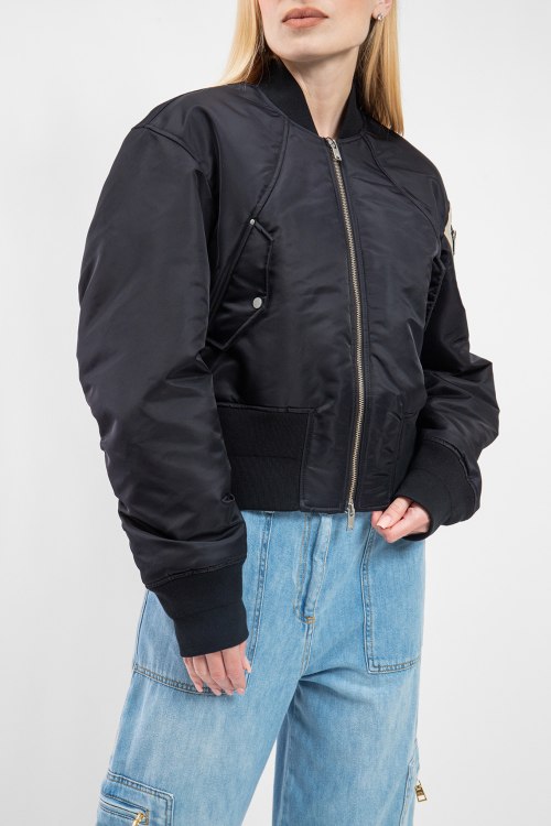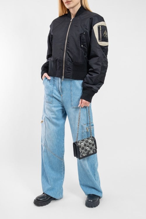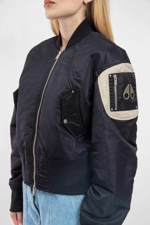 Детали: Женский черный бомбер из полиэстера от Moose Knuckles (Мус Наклс). Воротник-стойка, нашивка с логотипом на рукаве, боковые карманы с клапаном на кнопке, застежка-молния, классическая длина, трикотажные манжеты и нижний край. Размер на фото S