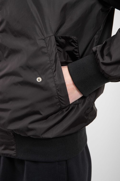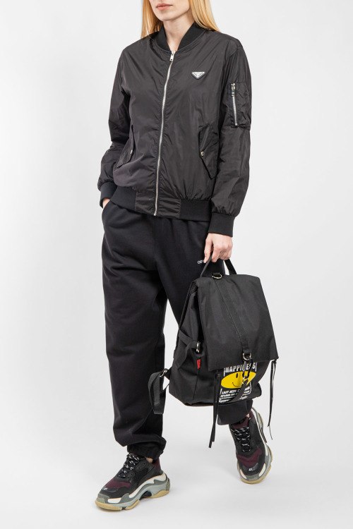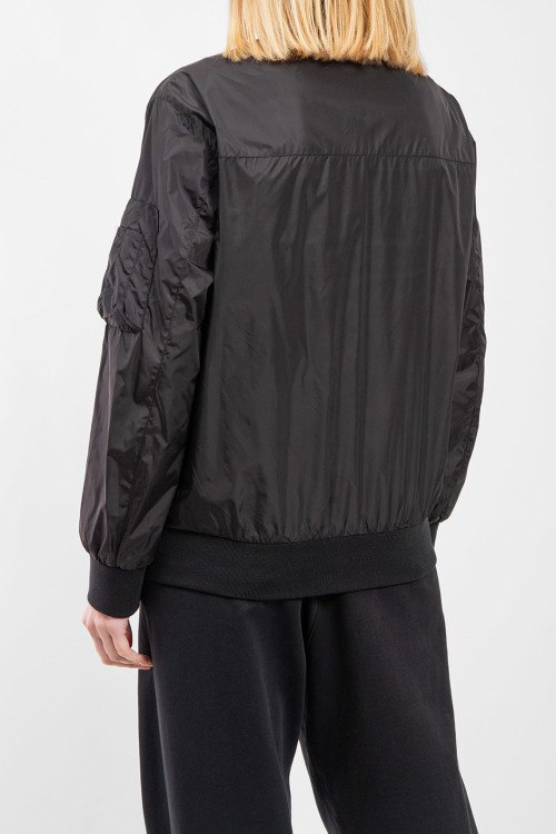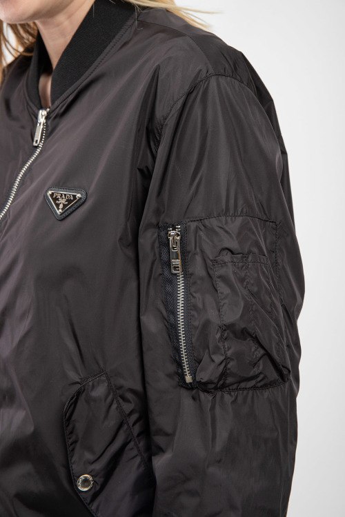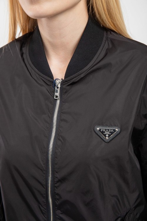 Женская черная куртка-бомбер из полиэстера от Prada (Прада). классическая длина, застежка на молнию, трикотажная резинка на манжетах и по низу изделия, патч-лого на груди, прорезные карманы с клапаном на кнопке. Замеры для размера на фото: 48; длина - 65 см; ПОГ - 55 см; ПОТ - 53 см; ПОБ - 49 см; длина по внутреннему шву рукава - 46 см; ширина рукава - 21 см.