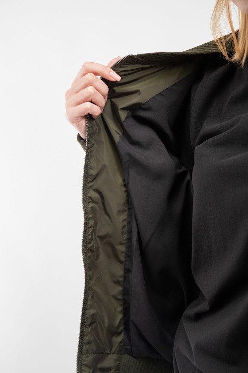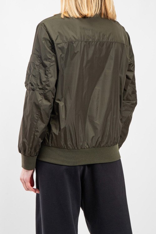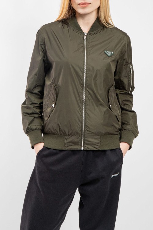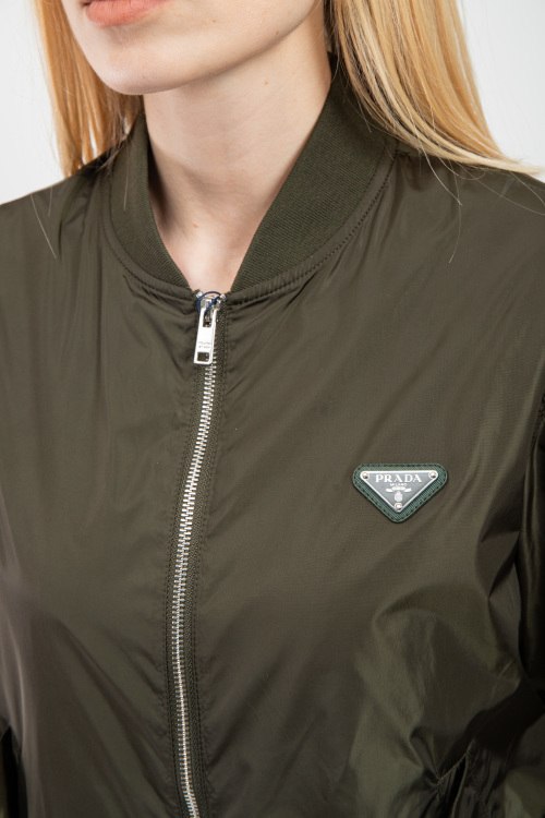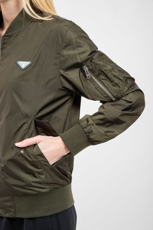 Женская куртка-бомбер цвета хаки из полиэстера от Prada (Прада). классическая длина, застежка на молнию, трикотажная резинка на манжетах и по низу изделия, патч-лого на груди, прорезные карманы с клапаном на кнопке. Замеры для размера: 50; длина - 62 см; ПОГ - 54 см; ПОТ - 52 см; ПОБ - 48 см; длина по внутреннему шву рукава - 45 см; ширина рукава - 21 см.