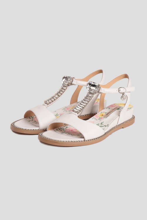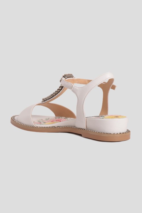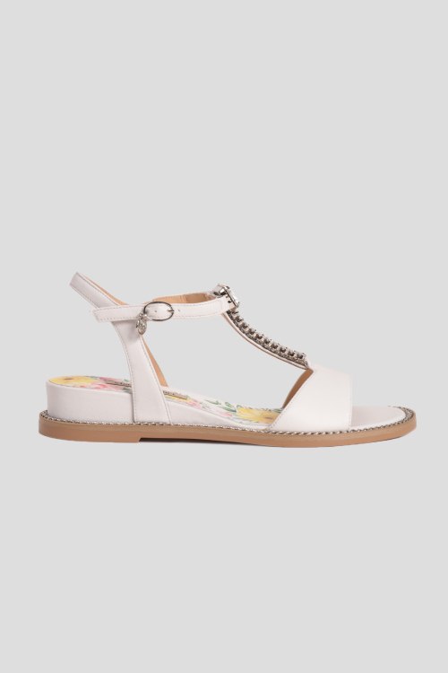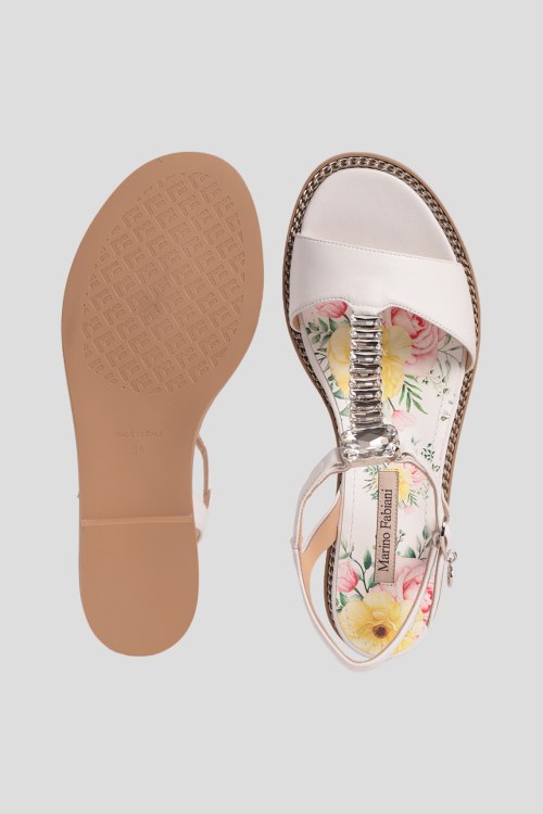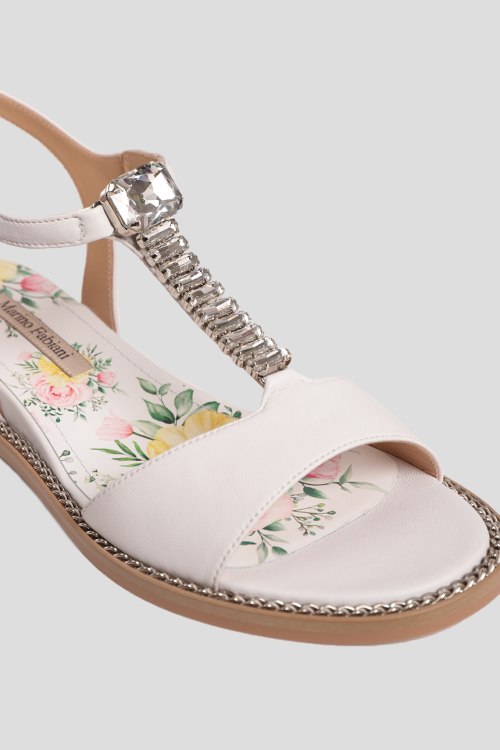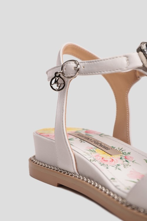 Женские белые босоножки из натуральной кожи от Marino Fabiani (Марино Фабиани). Закругленный носок, тонкие ремешки, декорированы кристаллами, логотип бренда, стелька с цветным принтом. Измерения: танкетка 3.5 см