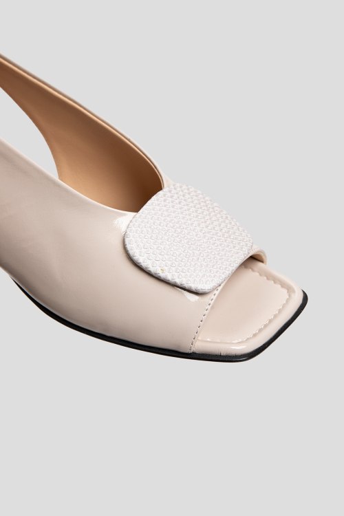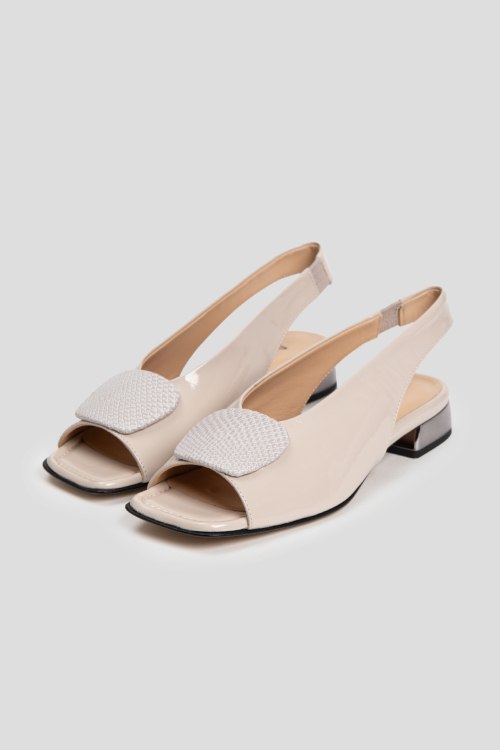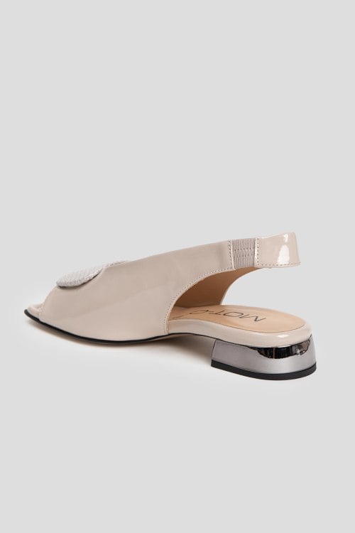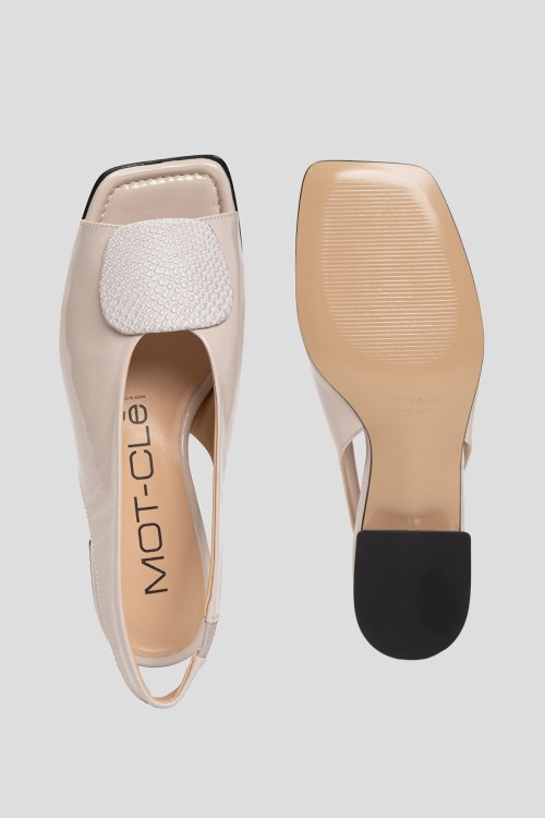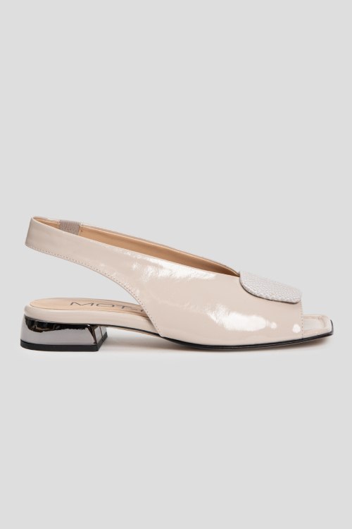Детали: Женские бежевые босоножки из лаковой кожи от Mot-Cle (Мот-Кле). Квадратный открытый носок, контрастная вставка, кожаная стелька с логотипом бренда, тонкий ремешок на заднике с эластичной вставкой. Высота каблука 2 см