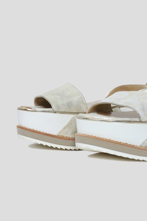 Женские босоножки из натуральной кожи цвета шампань от Stuart Weitzman (Стюарт Вейцман). Широкий ремешок спереди, ремешок с пряжкой на щиколотке, двухцветная платформа. Измерения: высота платформы 8 см