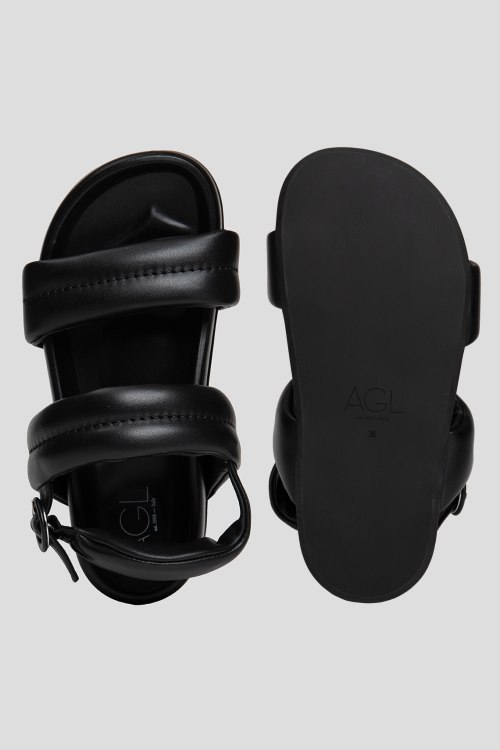 Детали: Женские черные босоножки из натуральной кожи от AGL (Аттилио Джусти Леомбруни). Закругленный носок, широкие дутые ремешки, регулируемый ремешок на заднике, толстая подошва, анатомическая стелька с логотипом бренда