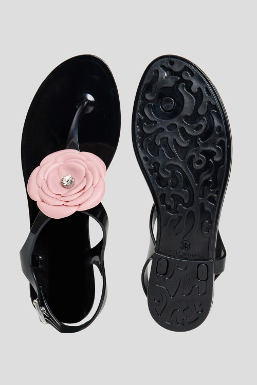 Женские черные сандалии из полиуретана от Amarene (Амарене). Закругленный носок, тонкий ремешок спереди между указательным и большим пальцем, декорированы объемным цветком розового цвета с кристаллом, регулируемая застежка на щиколотке