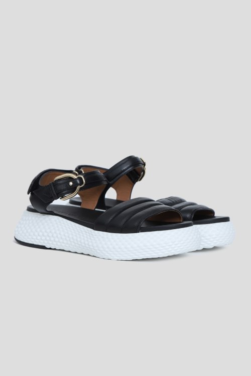 Детали: Женские черные босоножки из натуральной кожи от Armani (Армани). Стеганый ремешок спереди, ремешок с пряжкой на щиколотке, застежка-липучка на пятке, закругленный носок, массивная подошва, стелька с логотипом