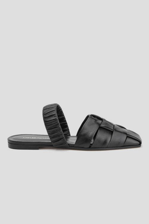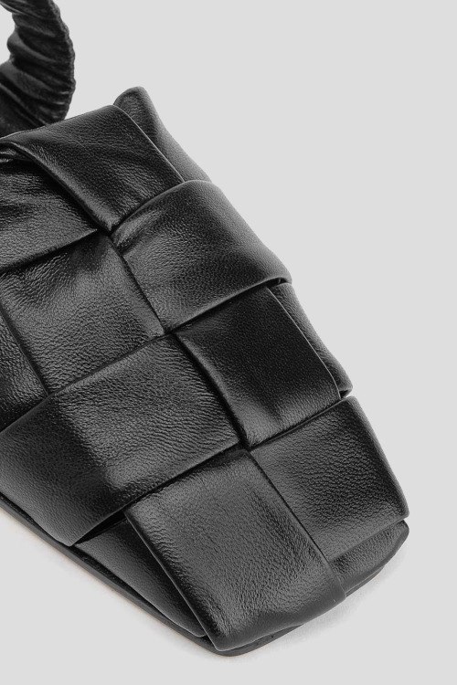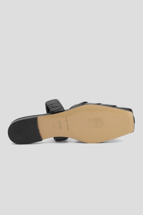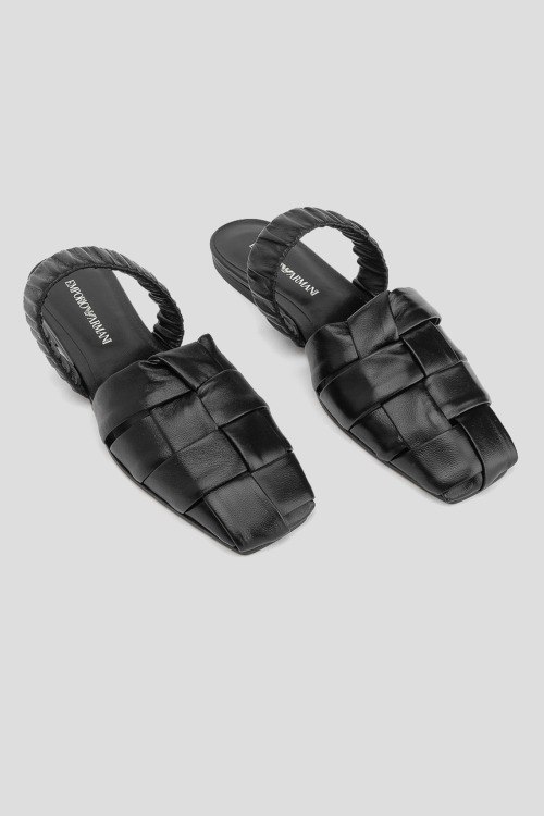 Детали: Женские черные босоножки из натуральной кожи от Emporio Armani (Эмпорио Армани). Дизайн в технике плетения Intrecciato, квадратный носок, плоская подошва, эластичный ремешок, кожаная стелька с логотипом бренда