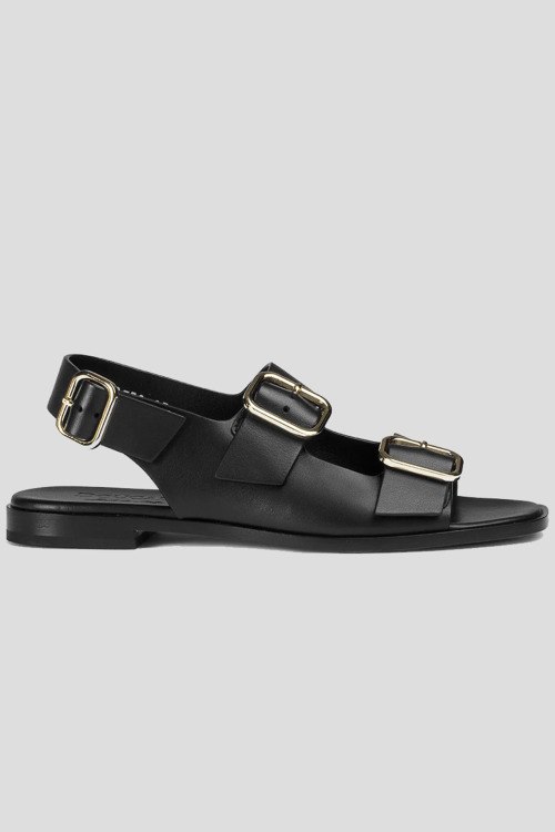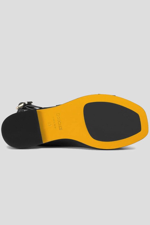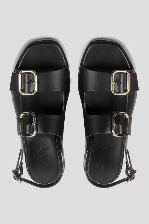 Детали: Женские черные сандалии из натуральной кожи от Doucal's (Дукалс). Квадратный носок, регулируемый ремешок, металлическая фурнитура серебристого цвета, кожаная стелька с лого, плоская подошва