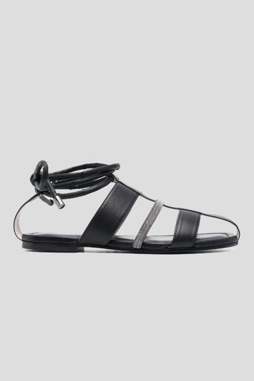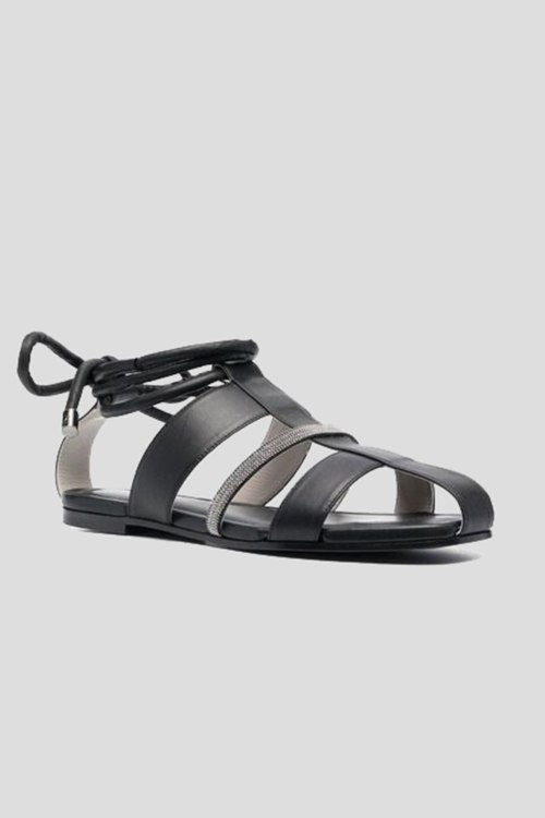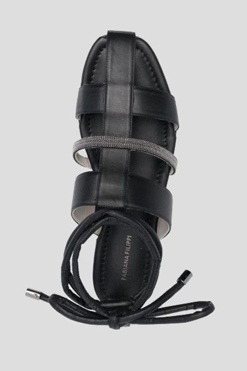 Детали: Женские черные кожаные сандалии от Fabiana Filippi (Фабиана Филиппи). Передние ремешки, декор стразами, завязки на щиколотке, закругленный носок