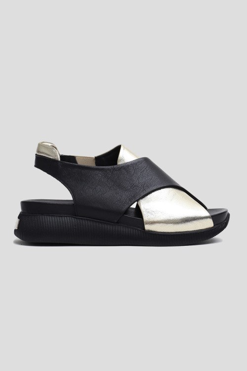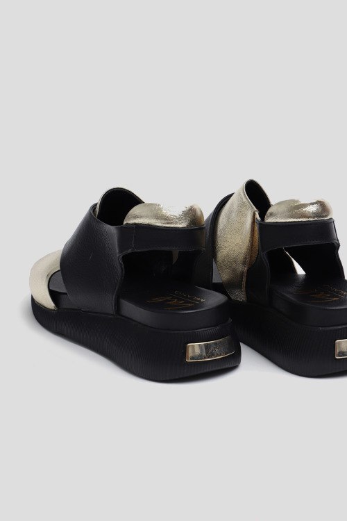 Детали: Женские золотисто-черные босоножки из кожи от Lab Milano (Лаб Милано). Комбинированный дизайн. закругленный носок, высокая подошва. сбоку эластичная вставка, металлический логотип бренда. Измерения: высота подошвы: 3-5 см (на размер 37)