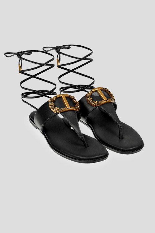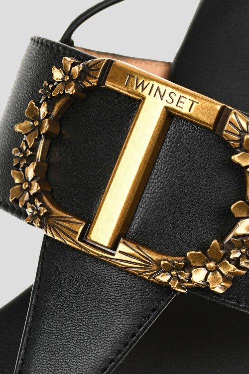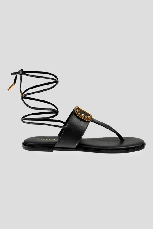 Детали: Женские черные кожаные сандалии от TWINSET (Твинсет). Модель из гладкой кожи, металлическая пряжка с логотипом, тонкие завязки вокруг ноги, кожаная стелька с логотипом, закругленный носок