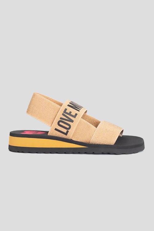 Детали: Женские золотистые текстильные сандалии от Love Moschino (Лав Москино). Эластичные резинки, принт с логотипом, закругленный носок. Подошва: 4 см