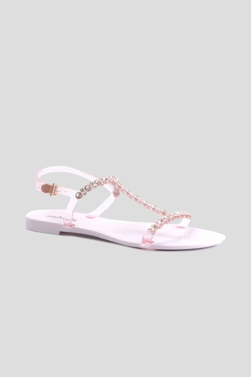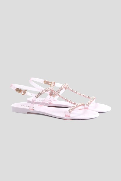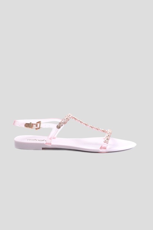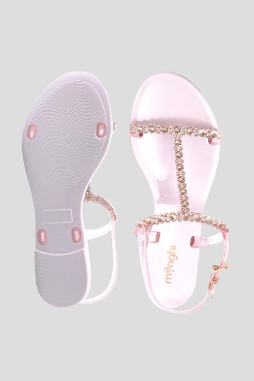 Детали: Женские розовые силиконовые сандалии от Menghi (Менги). Тонкие ремешки декорированы кристаллами, ремешок с пряжкой на пятке, закругленный носок, плоская подошва