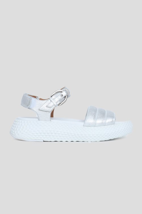 Детали: Женские серебристые босоножки из натуральной кожи от Armani (Армани). Стеганый ремешок спереди, ремешок с пряжкой на щиколотке, застежка-липучка на пятке, закругленный носок, массивная подошва
