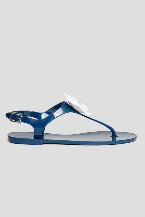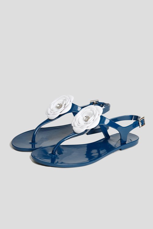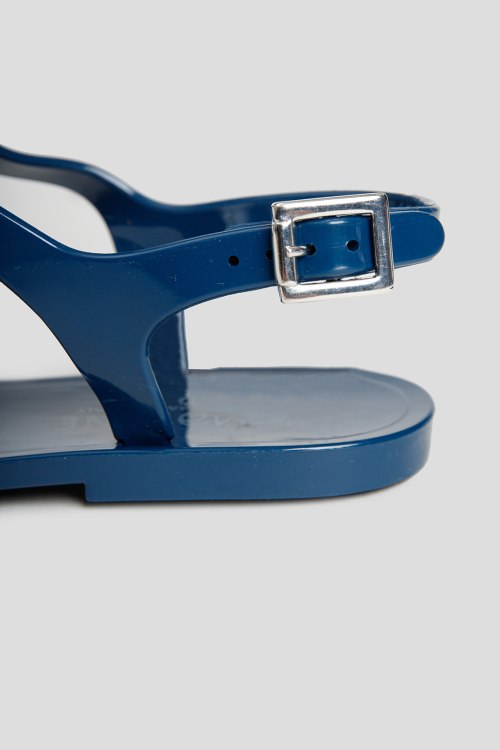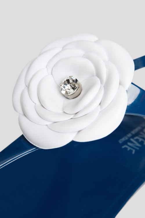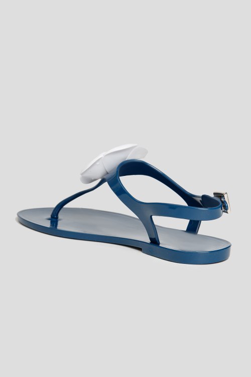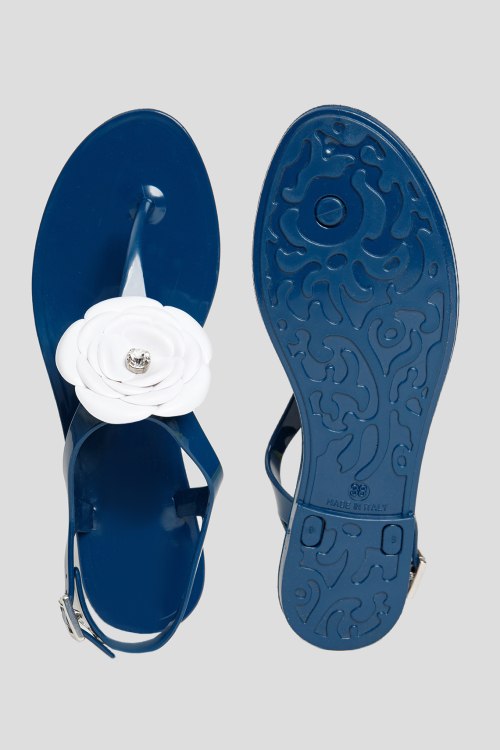 Женские темно-синие сандалии из полиуретана от Amarene (Амарене). Закругленный носок, тонкий ремешок спереди между указательным и большим пальцем, декорированы объемным цветком с кристаллом, регулируемая застежка на щиколотке