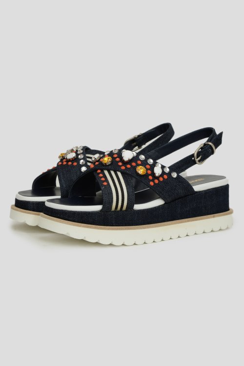 Детали: Босоножки цвета темно-синего цвета. Закругленный носок, перекрестные ремешки, застегивается на регулируемый ремешок, фирменный логотип, украшены кристаллами