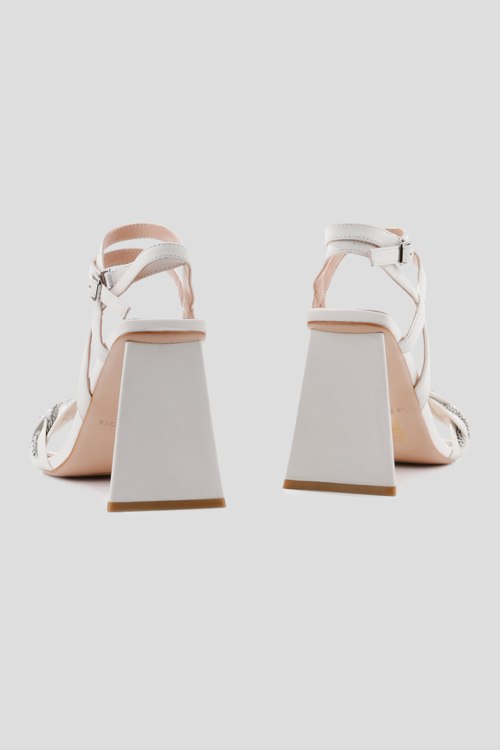 Детали: Женские босоножки на каблуке молочного оттенка из натуральной кожи от Le Berdes (Ле Бердес). Квадратный открытый носок, открытая пятка, тонкий ремешок с застежкой на щиколотке, брендированная кожаная стелька, треугольный широкий каблук, спереди модель декорирована плетением и цепочкой. Высота каблука: 9 см