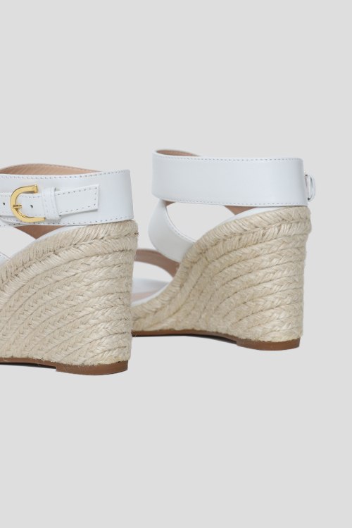 Детали: Женские белые босоножки из натуральной кожи от Stuart Weitzman (Стюарт Вейцман). Ремешок спереди, ремешок с пряжкой на щиколотке, плетеная танкетка. Измерения: высота танкетки 9 см, высота платформы 2 см