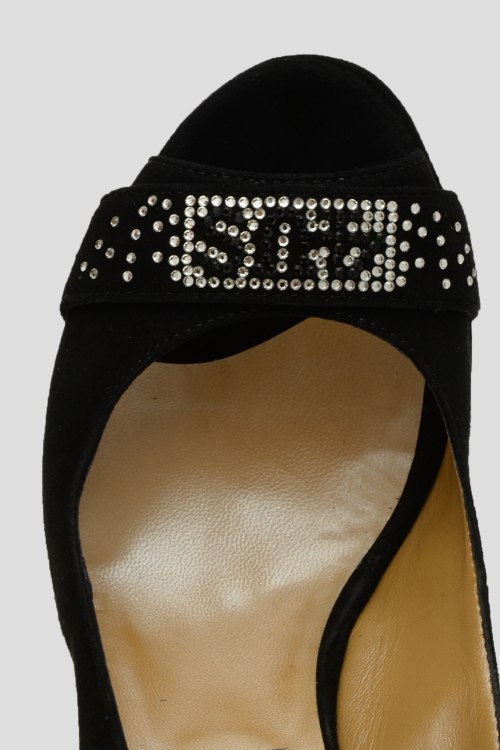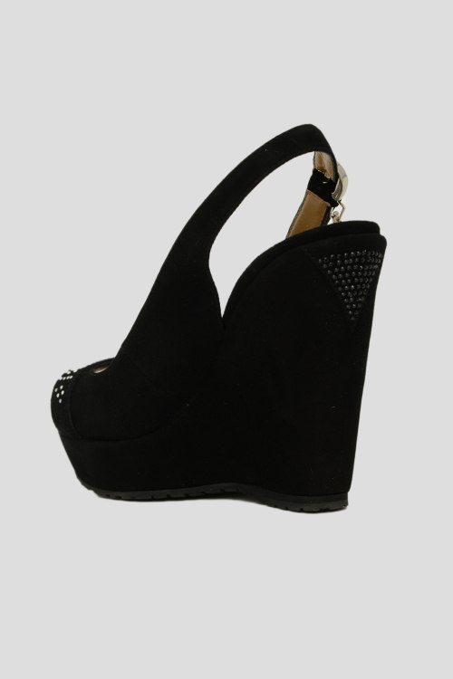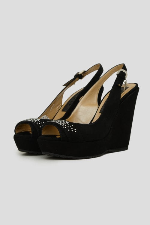 Детали: Босоножки из натуральной замши и кожи. Однотонная модель, высокая танкетка, сбоку застежка. Дополнены стразами