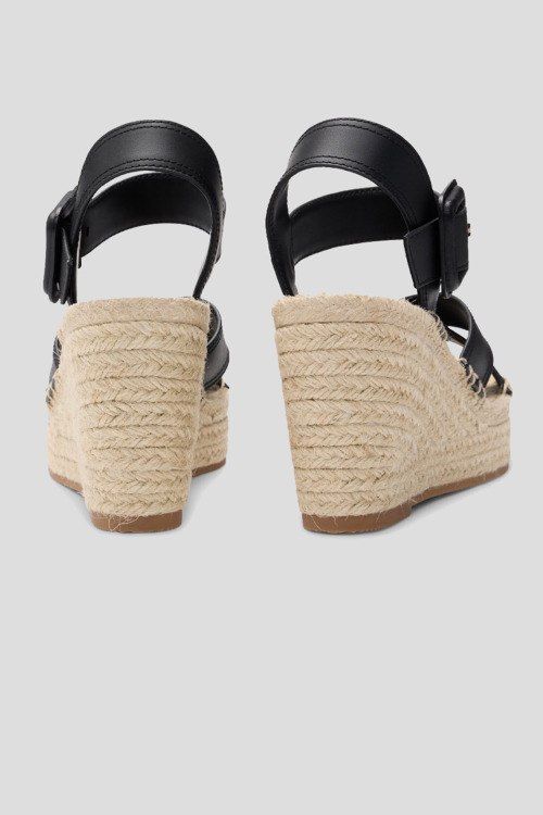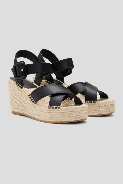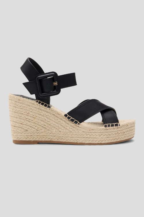 Детали: Женские черные кожаные босоножки Madeira от Hugo Boss (Хуго Босс). Модель из гладкой кожи, ремешки крест-накрест, ремешок с пряжкой, закругленный носок, плетеная танкетка