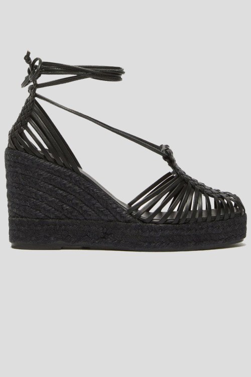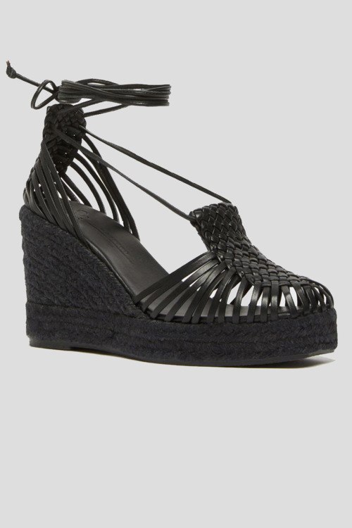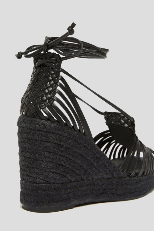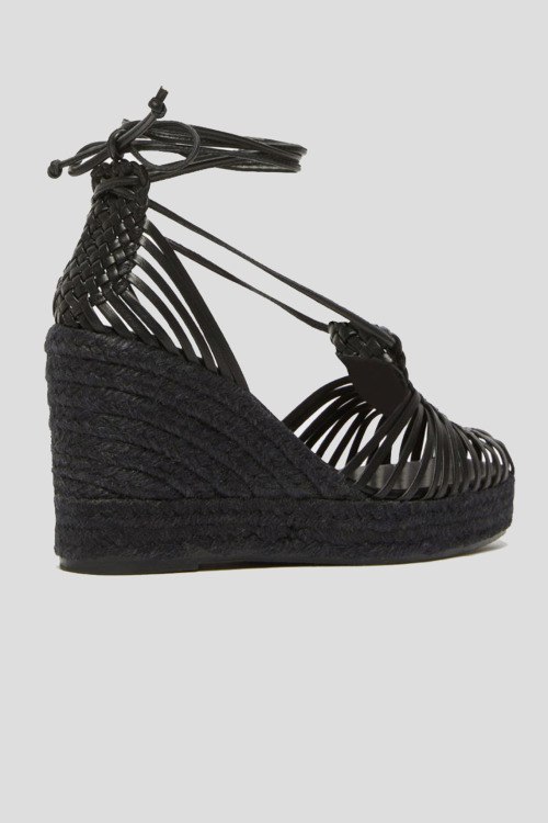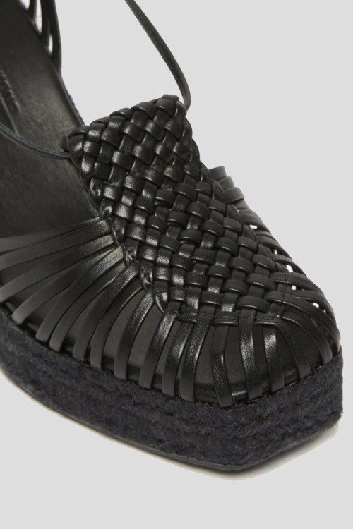 Женские черные кожаные босоножки от Max Mara Weekend (Макс Мара Викенд). Тонкие ремешки из гладкой кожи, детали с плетением, квадратный носок, завязки на щиколотке, танкетка из рафии. Высота танкетки: 9 см