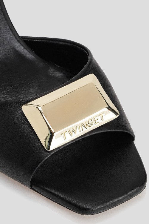 Детали: Женские черные кожаные босоножки от TWINSET (Твинсет). Золотистый логотип на ремешке спереди, квадратный носок, тонкий ремешок с пряжкой на щиколотке, стелька с логотипом, широкий каблук, плоская подошва. Высота каблука: 8,5 см