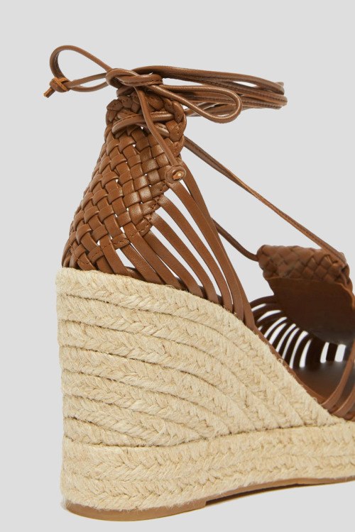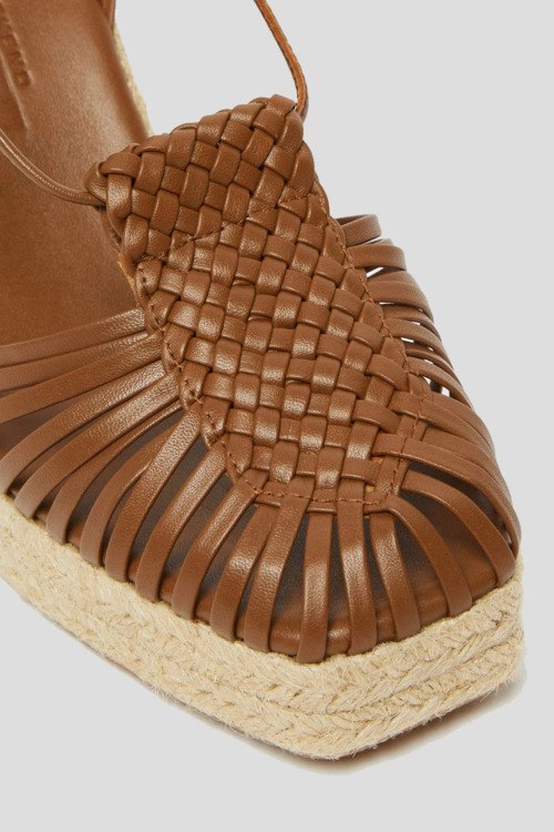 Женские коричневые кожаные босоножки от Max Mara Weekend (Макс Мара Викенд). Тонкие ремешки из гладкой кожи, детали с плетением, квадратный носок, завязки на щиколотке, танкетка из рафии. Высота танкетки: 9 см