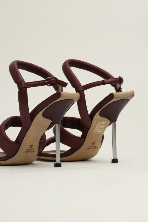 Детали: Женские бордовые босоножки из кожи от Malloni (Маллони). Квадратный носок, высокий металлический каблук-шпилька, тонкий ремешок. застежка на регулируемый ремешок на щиколотке, фирменный лого на стельке