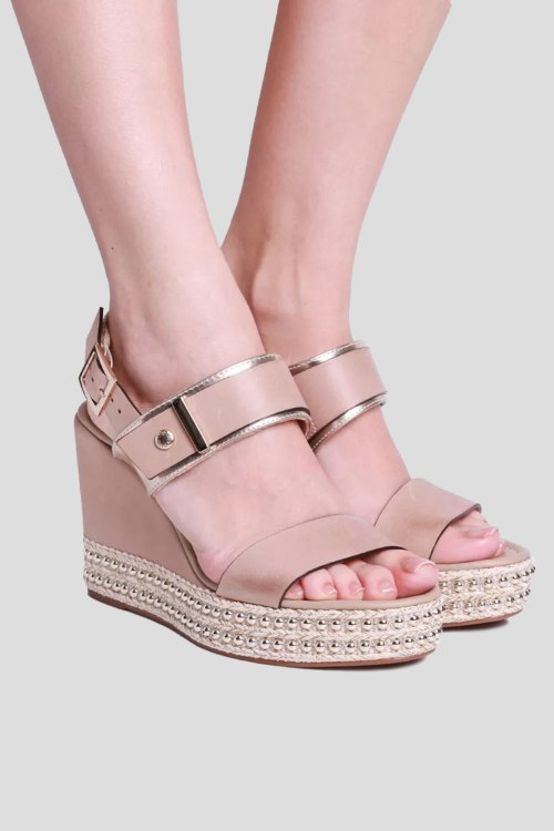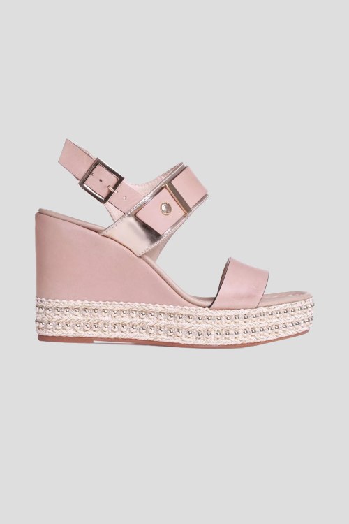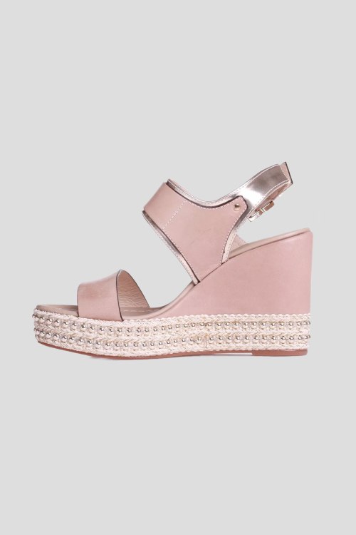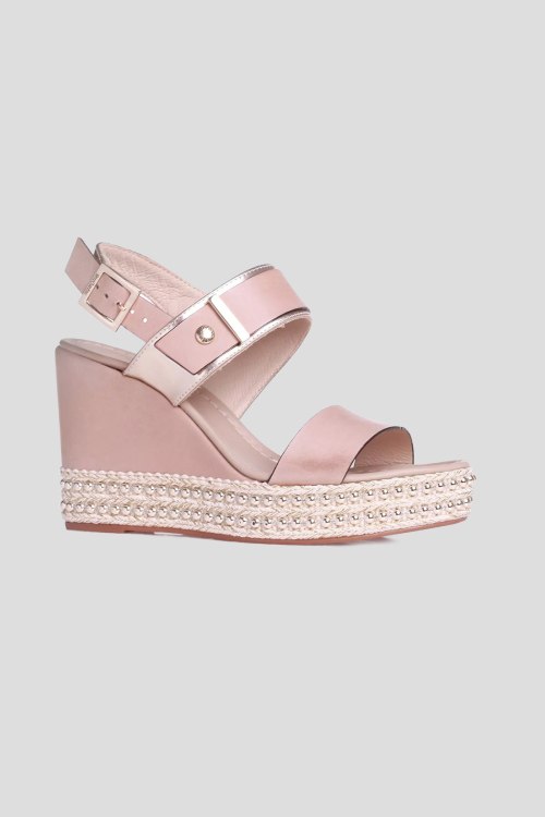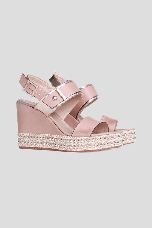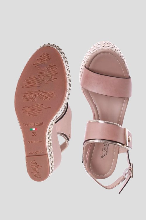 Детали: Женские пудровые кожаные босоножки от Nero Giardini (Неро Джардини). Модель из гладкой кожи, два ремешка спереди, ремешок с пряжкой на пятке, закругленный носок, подошва декорирована плетением и бусинами. Высота каблука: 10 см, платформа: 3 см